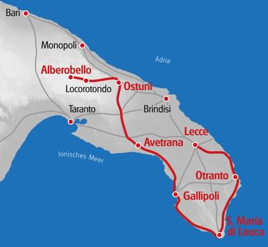 Von Ostuni geht es durch Olivenhaine, Weinanbaugebiete und Obstkulturen bis nach Avetrana, einer geschichtsträchtigen Kleinstadt an der alten Via Appia. Diese alte Römerstrasse führte einst von Rom über Taranto und Oria bis nach Brindisi. Heute sind nur mehr einige Teilstücke des alten gepflasterten Weges als Via Appia Antica erhalten.