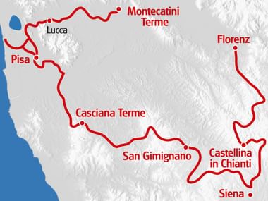 Die Toskana ist eine traumhafte, aber auch hügelige Landschaft. Auf herrlichen Nebenstraßen und Feldwegen radeln wir von einer bekannten Stadt zur anderen. Bei Stadtein- und ausfahrten muss fallweise mit stärkerem Autoverkehr gerechnet werden