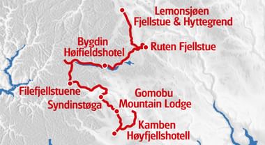 Von Filefjell aus folgen Sie der Hauptstrasse und teilweise der „Königsstraße“ hinunter zum See Vangsmjøsa. Von hier aus folgen Sie diesem wunderschönen See entlang steiler Hänge, bis Sie wieder aufsteigen müssen, um das Syndin-Plateau und Syndinstøga auf ca. 1000 m ü. M. zu erreichen. Dieser Abschnitt ist möglicherweise die anspruchsvollste Etappe der Mjølkevegen-Route, nehmen Sie sich die Zeit, die Sie brauchen.