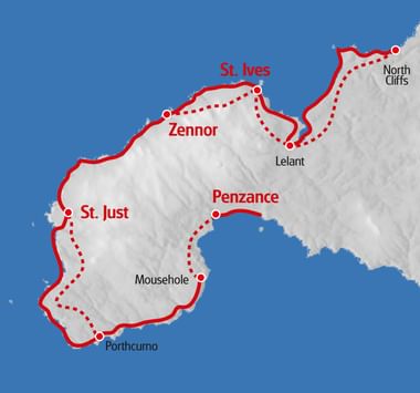 Stetes Auf und Ab hoch über dem Meer prägt die heutige Etappe, einige Abschnitte sind felsig und steil. Doch die Mühen werden mit Ausblicken auf das Meer und die Hochflächen belohnt. Am Ende der Etappe erreichen Sie das kleine Dorf Zennor, wo ein Besuch in der Kirche und im Pub lohnt. Von hier mit dem doppelstöckigen Panoramabus zurück nach St. Ives.
